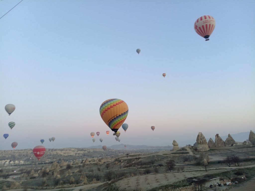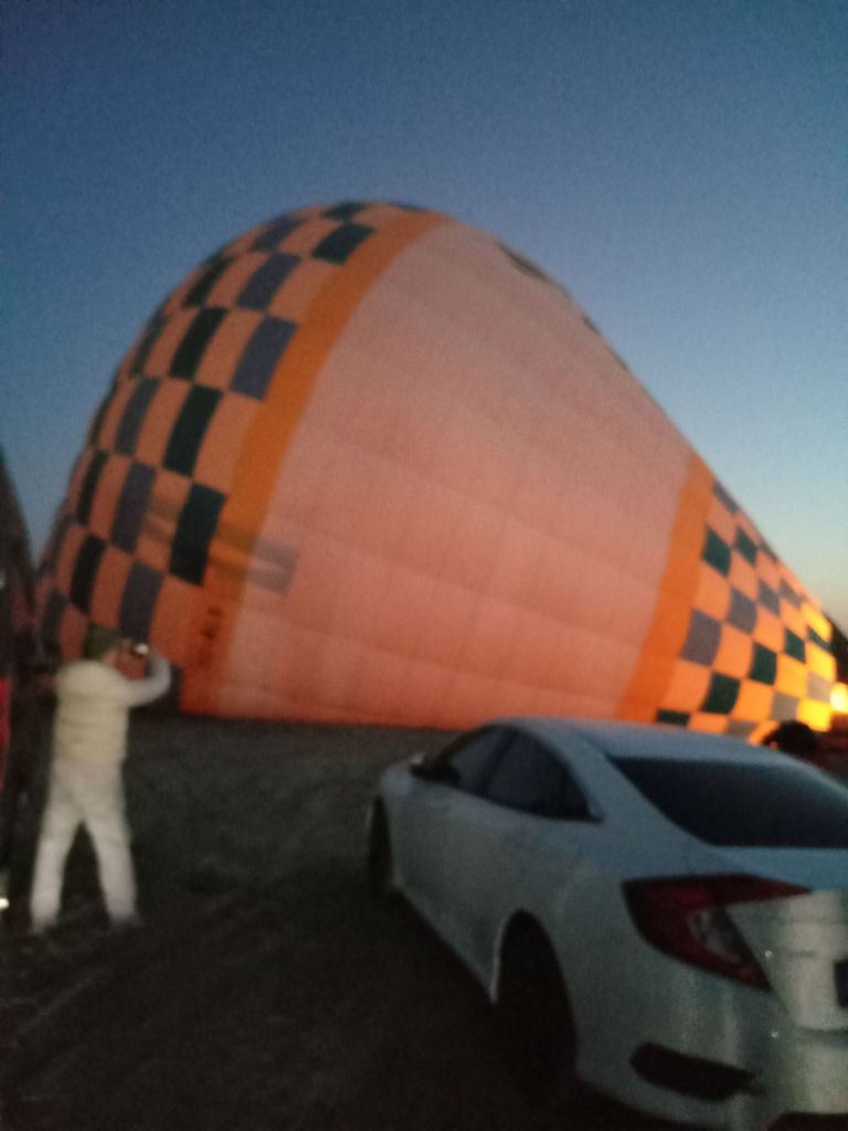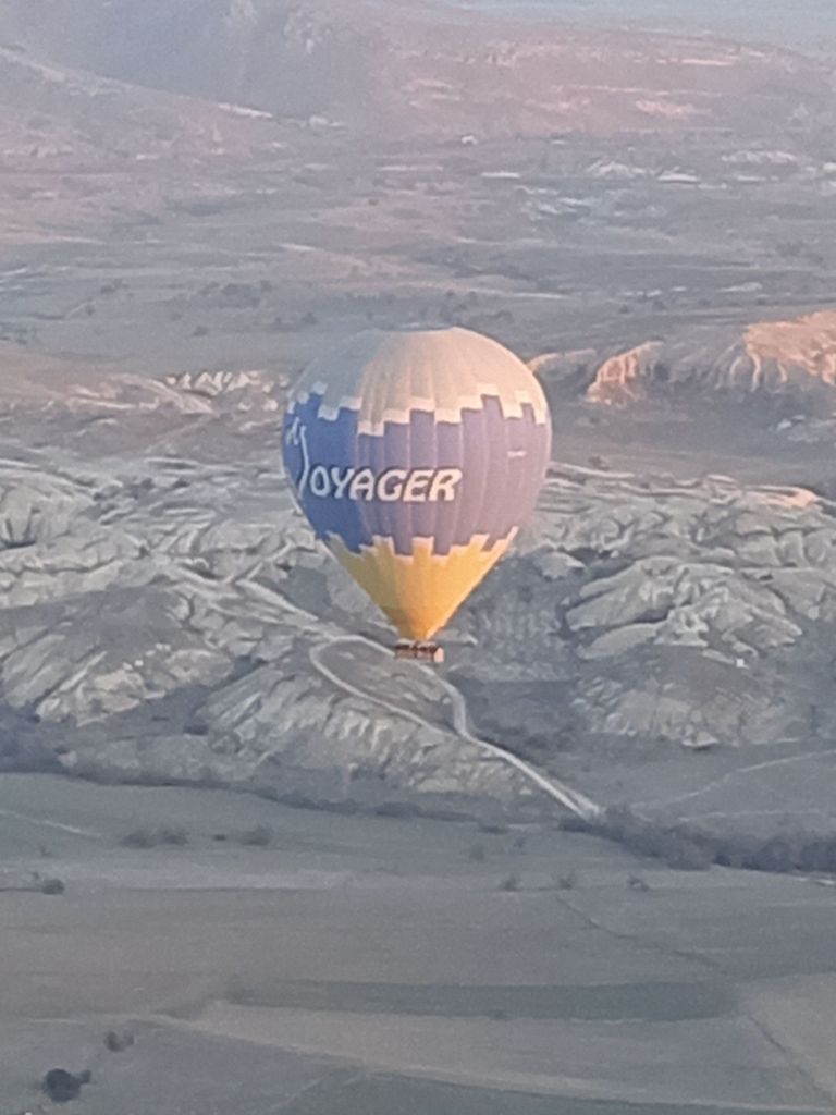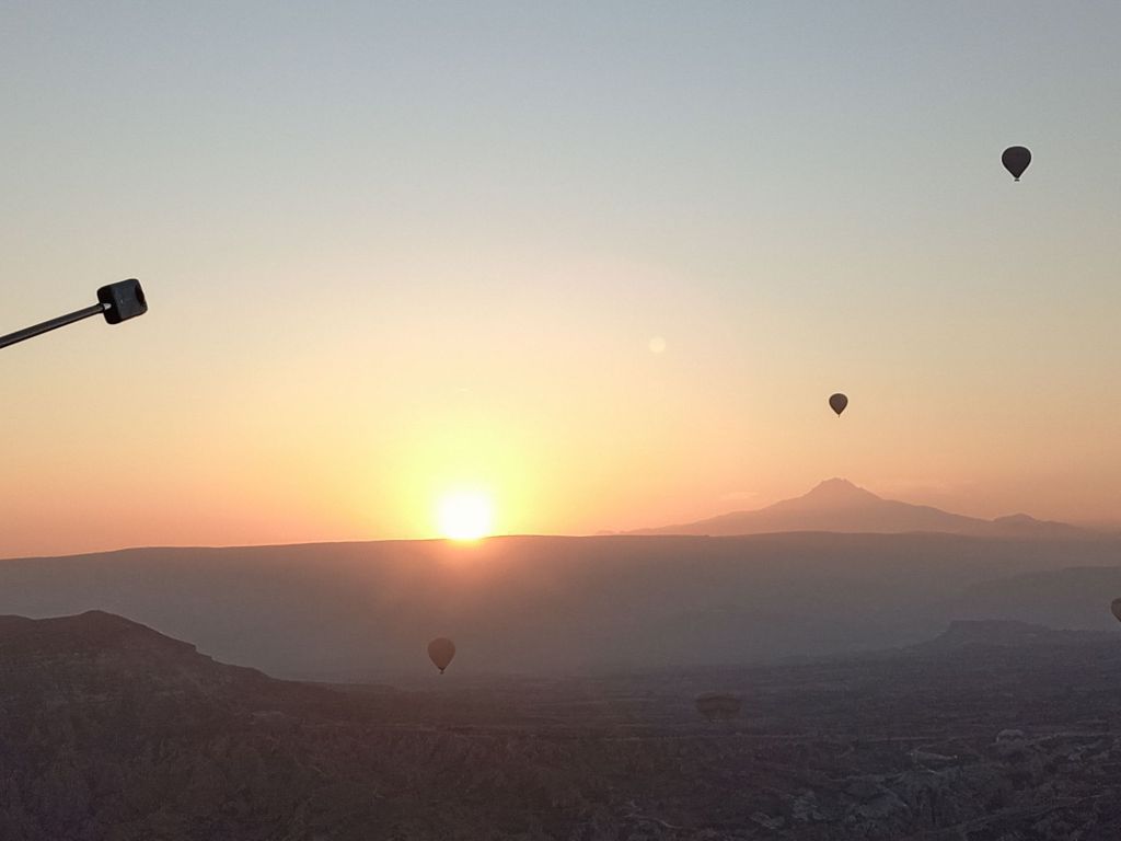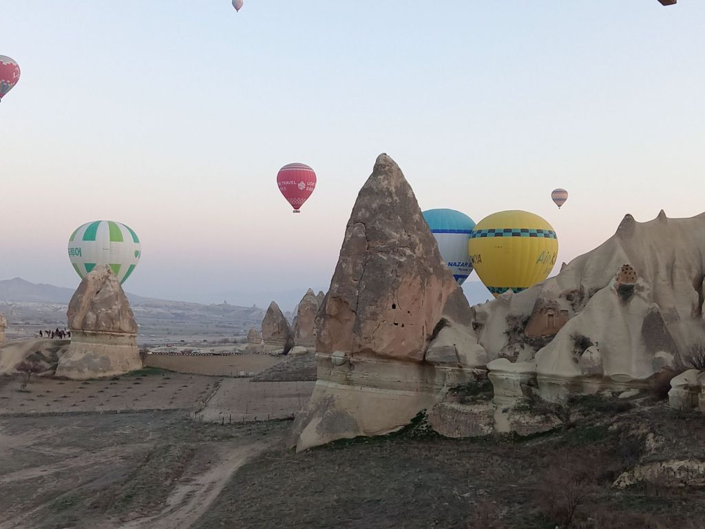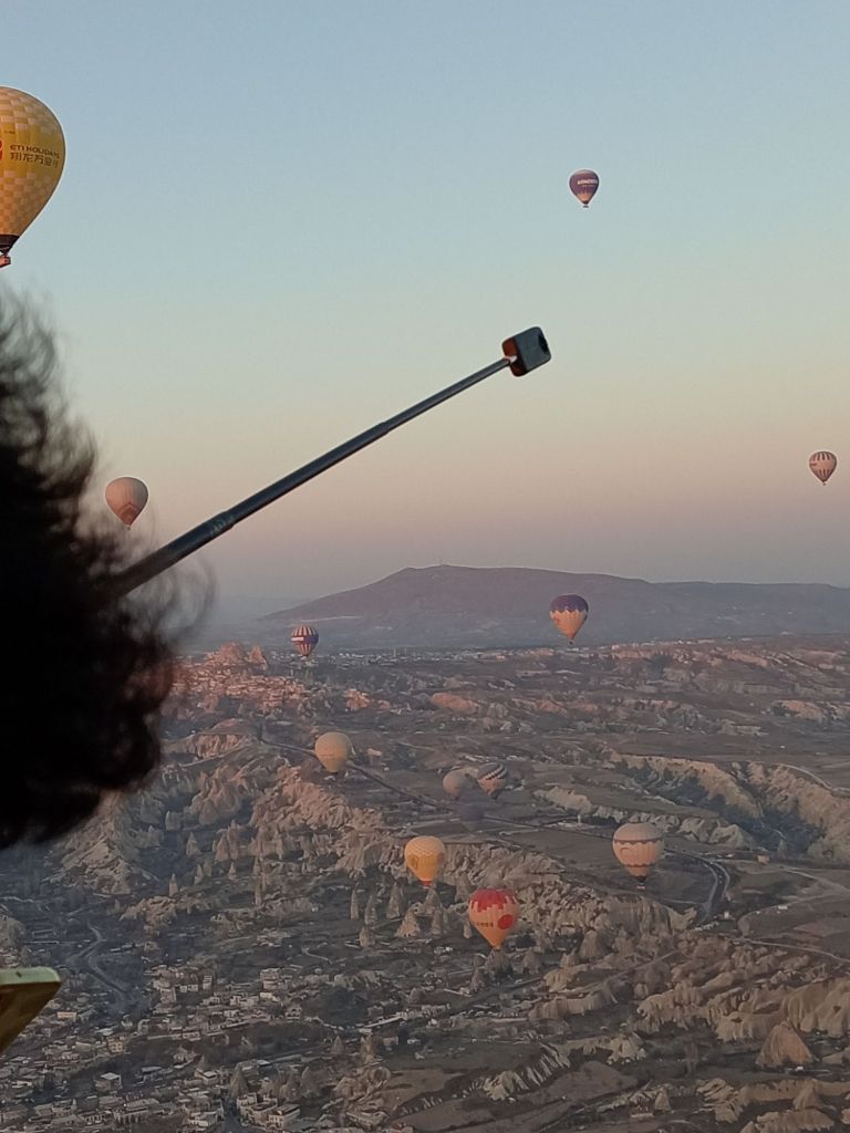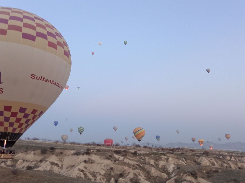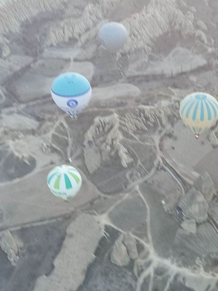 Încet-încet se luminează de ziuă, urcăm în nacela pe jumătate ocupată de un grup de coreeni, adică eu sunt mai mult urcată, Ștefan mă împinge de fund, iar un coreean mă trage de o mână. Uf! Am urcat 32 de turiști, alături de un ”căpitan” și un ajutor. Balonul mai are nevpie de ceva ”jăratic”, de jos e susținut de încă două persoane cu niște frânghii groase, apoi ușurel, tocmai la momentul oportun, cei de jos scot frânghia, iar noi ne ridicăm fără cel mai mic balans, acum mă simt ca un fluture imens, dar incredibil de ușor.