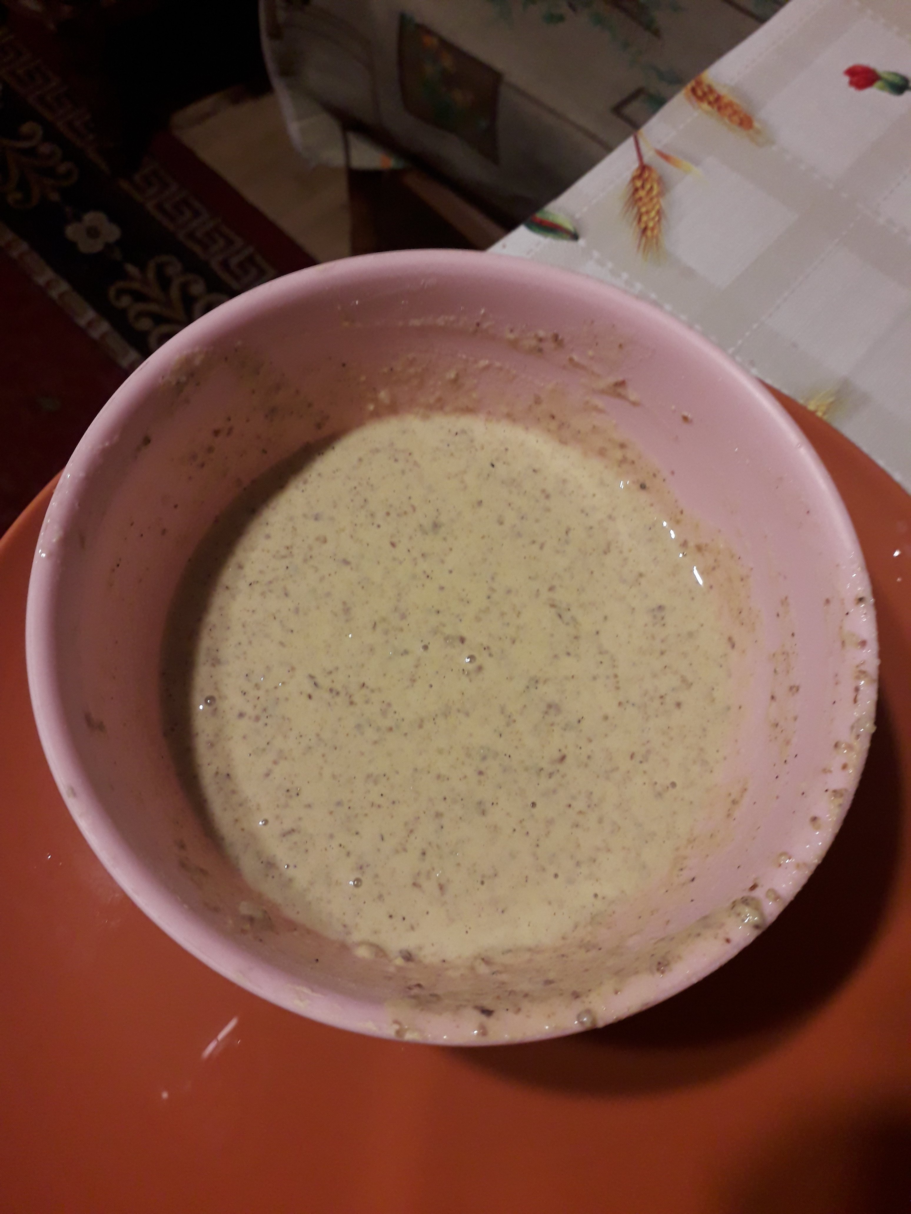 După ce dovleacul s-a răcit, le-am amestecat pe toate, obținând un aluat ceva mai consistent decât cel pentru blatul de tort.