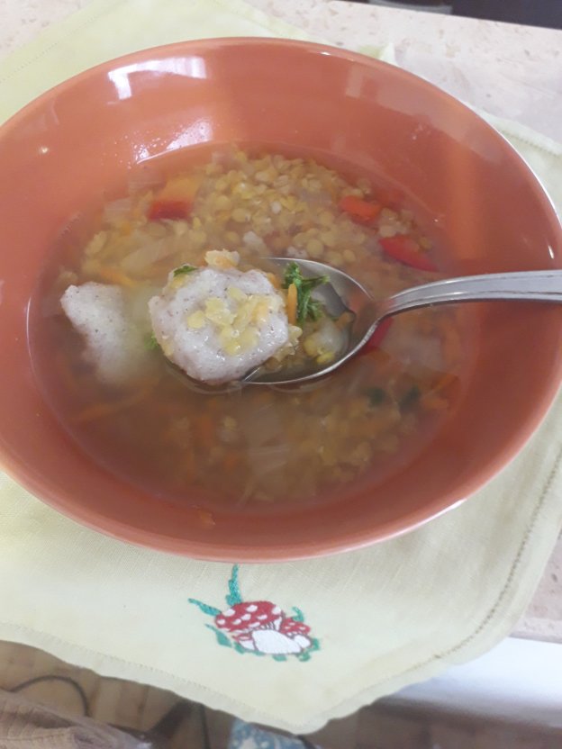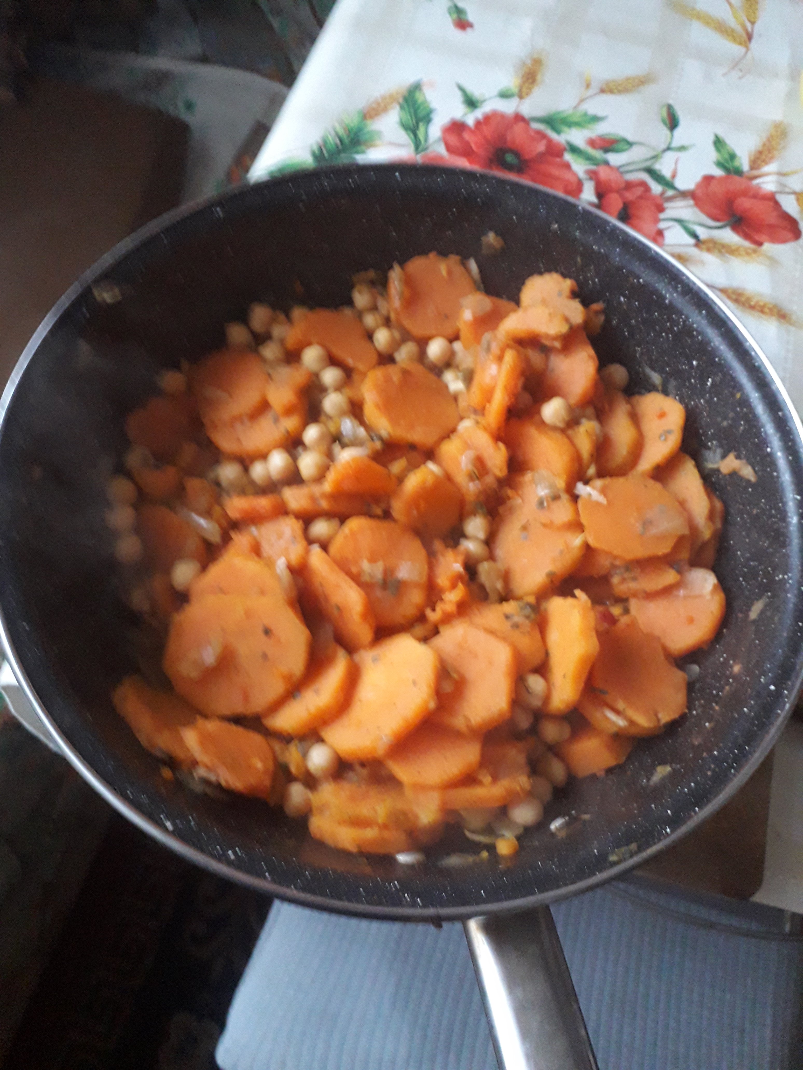 Drept că el a lăsat bucăți mai mari, eu l-am mărunțit. Am pus 4 căni de apă într-o cratiță, am deșertat bolul cu dovleac și l-am fiert câteva minute, până când s-a înmuiat. Am pus și un pic de sare în apă. L-am luat de pe foc și l-am pus afară, la răcit.